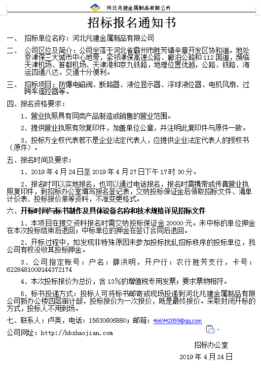 - 招標(biāo)業(yè)主: 河北兆建金屬制品有限公司