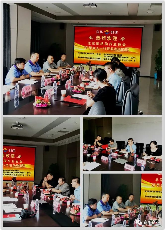 2020年7月25日上午,北京鋼結(jié)構(gòu)行業(yè)協(xié)會(huì)會(huì)長胡勇、北京鋼結(jié)構(gòu)行業(yè)協(xié)會(huì)秘書長常海君、北京鋼結(jié)構(gòu)行業(yè)協(xié)會(huì)常務(wù)理事(北京華龍聯(lián)合建設(shè)工程有限公司董事長)王廣飛、北京鋼結(jié)構(gòu)行業(yè)協(xié)會(huì)秘書處史君蒞臨京華兆建參觀考察。