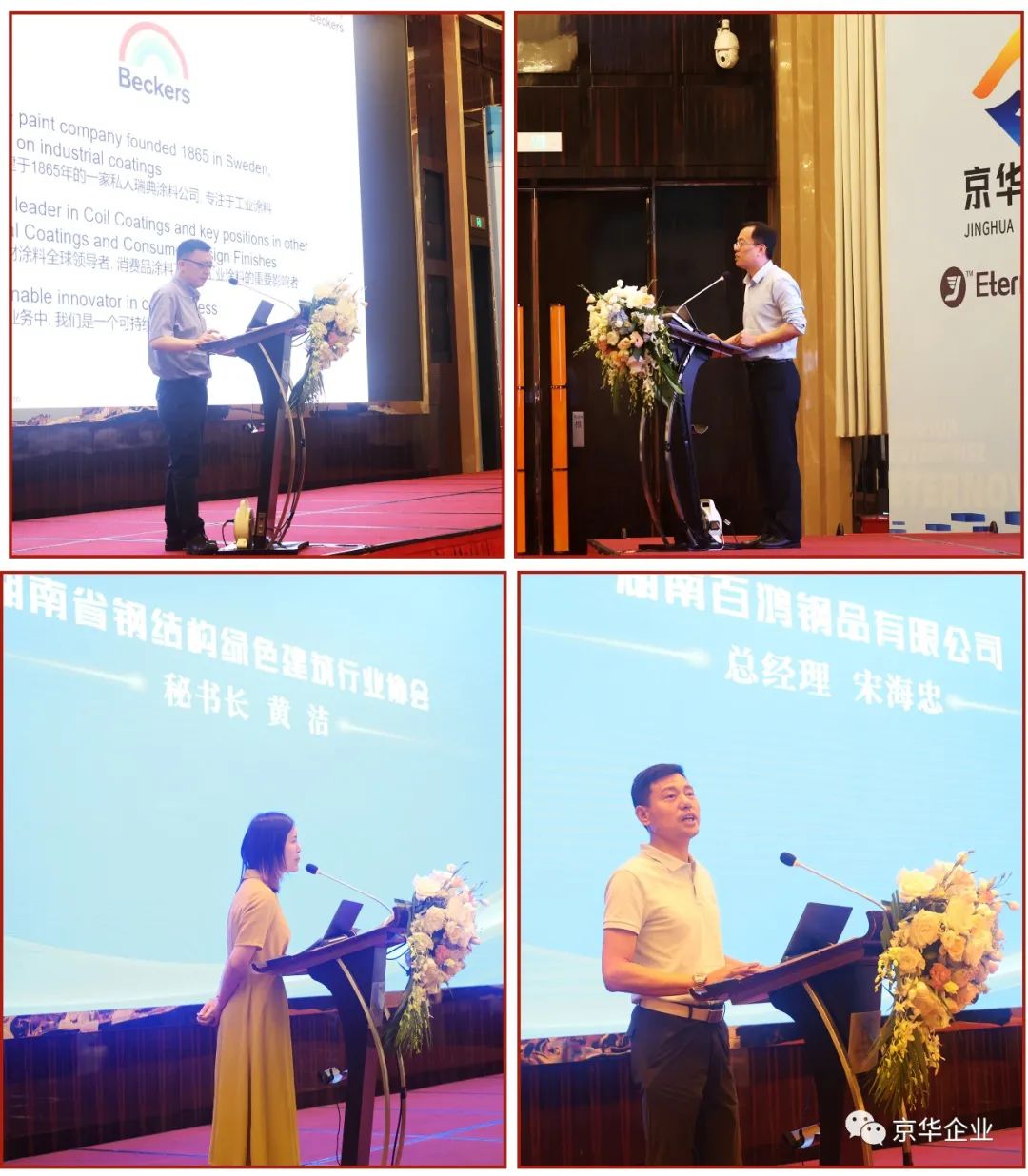 “恒新“合作方國際卷材涂料領(lǐng)導(dǎo)品牌的代表;蘭格鋼鐵網(wǎng)的李釗副總經(jīng)理;湖南省鋼結(jié)構(gòu)綠色建筑行業(yè)協(xié)會(huì)秘書長黃潔女士;發(fā)表了精彩的演講。湖南百鴻鋼品有限公司總經(jīng)理宋海忠是京華企業(yè)彩涂產(chǎn)品的老用戶,代表廣大湖南地區(qū)的客戶發(fā)言。
