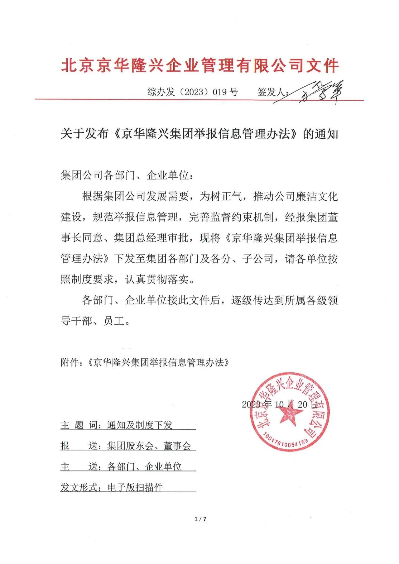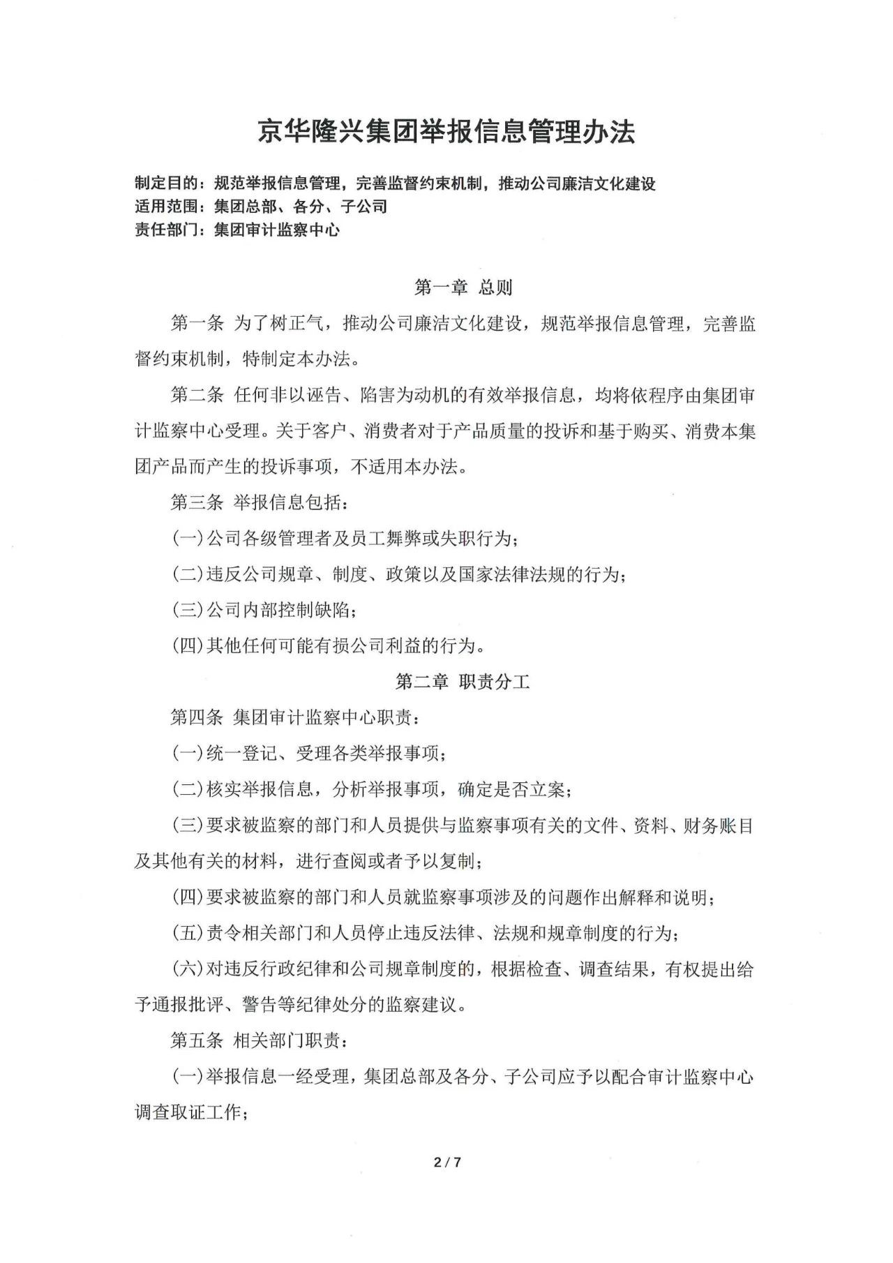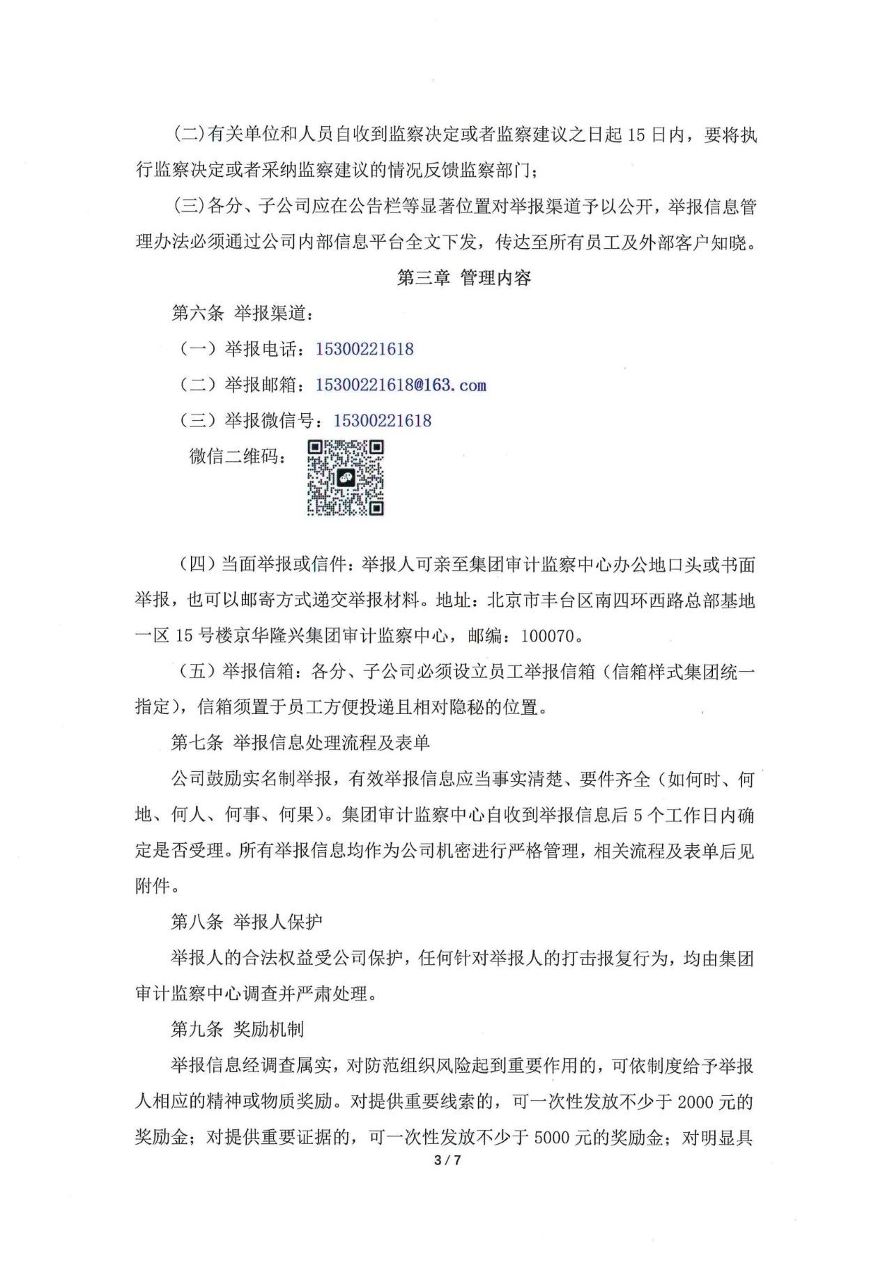 京華·各合作單位、產(chǎn)品供應商:根據(jù)我公司發(fā)展需要,為進一步推動我公司內(nèi)部的廉潔文化建設,也為了保障貴單位在與我公司合作過程中的公平公正,確保合作共贏,現(xiàn)公布集團文件《京華隆興集團舉報信息管理辦法》,請各合作單位悉知。
